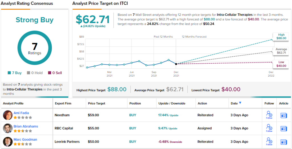 Overall, we’re looking here at a biopharma with plenty of clinical trials underway – and the added bonus of an approved drug on the market. Shares in ITCI are up 63% over the past 12 months, a strong gain that Wall Street’s analysts believe will be followed by additional gains next year.