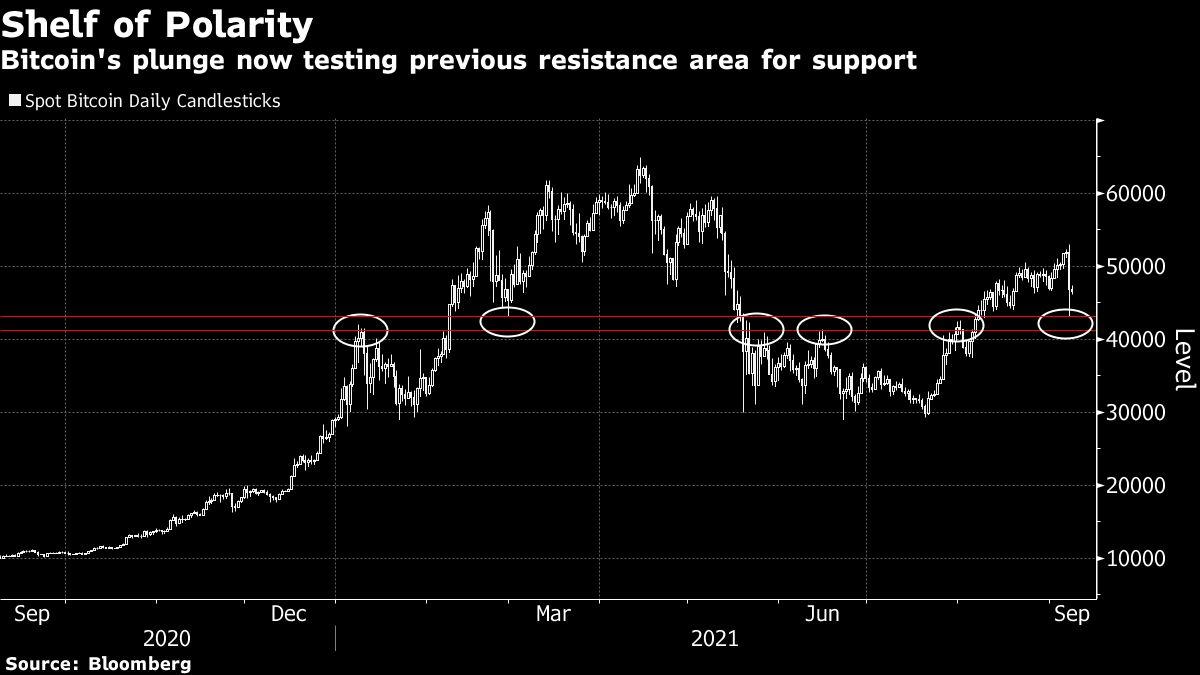 (Bloomberg) — Bitcoin’s slump following El Salvador’s troubled rollout of the largest cryptocurrency as legal tender has put several key technical levels into focus that could point to greater losses ahead.