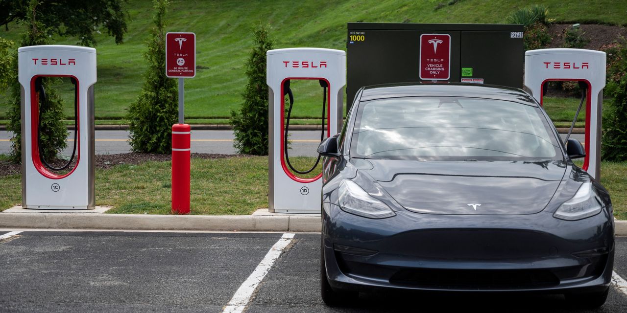 A Tesla super charging station in Arlington, Virginia